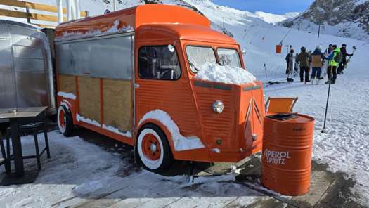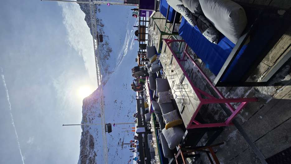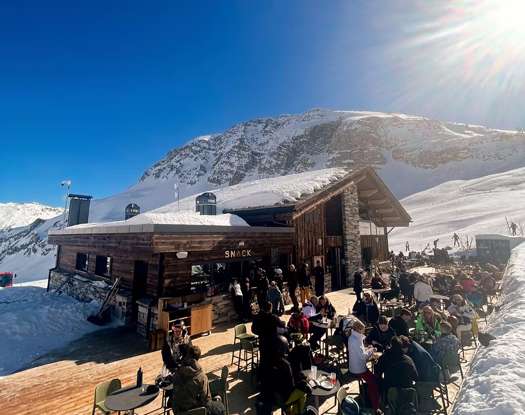 The terrace offers fantastic views of the east slopes of Tignes, with a lively atmosphere driven by the DJ in the gondola bubble and the Aperol Spritz van.