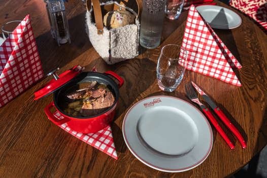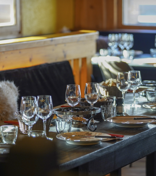 Indoors, the restaurant offers a more refined menu (€31 to €42) with a classic chalet-style look and warmth for colder days, where you can enjoy the Italian creations and French classics like escargots and fondue, or larger plates to share among the crew.